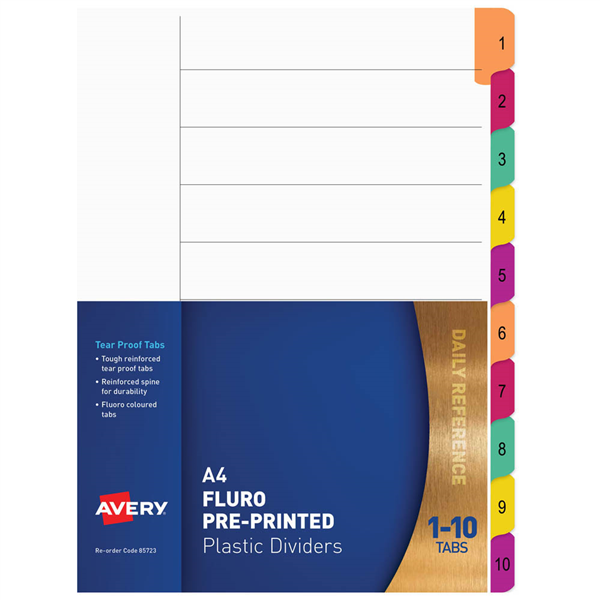 AVERY 85723 DIVIDER PLASTIC 1-10 INDEX TAB A4 FLUORESCENT MULTI COLOURS