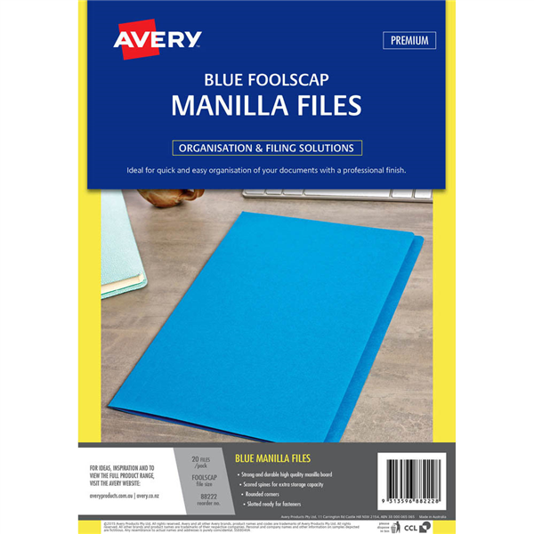 An Avery Manilla File is a simple filing solution to help you get organised Mix and match with different colours so filing is no longer boring! Avery Manilla Files offer the highest quality from a strong and durable manilla board Ideal for projects or personal files and suitable for compact archiving into storage systems Available in buff, range of other colours and foolscap, A4 sizes