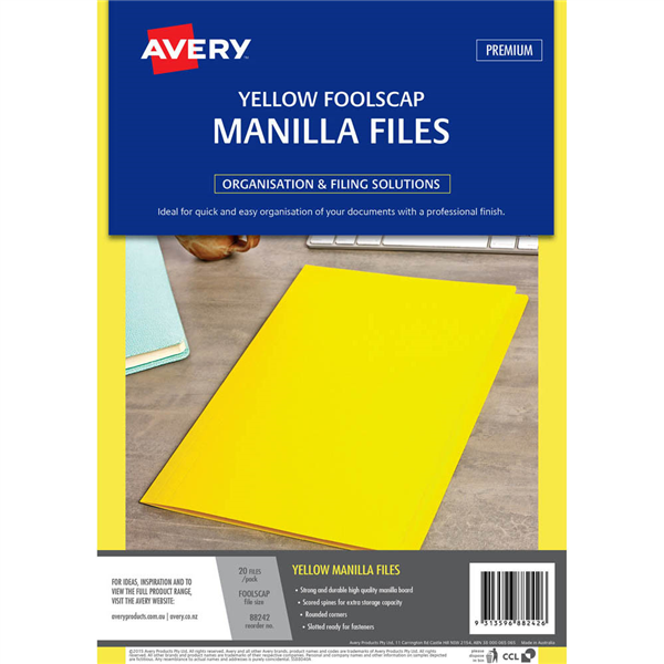 An Avery Manilla File is a simple filing solution to help you get organised Mix and match with different colours so filing is no longer boring! Avery Manilla Files offer the highest quality from a strong and durable manilla board Ideal for projects or personal files and suitable for compact archiving into storage systems Available in buff, range of other colours and foolscap, A4 sizes