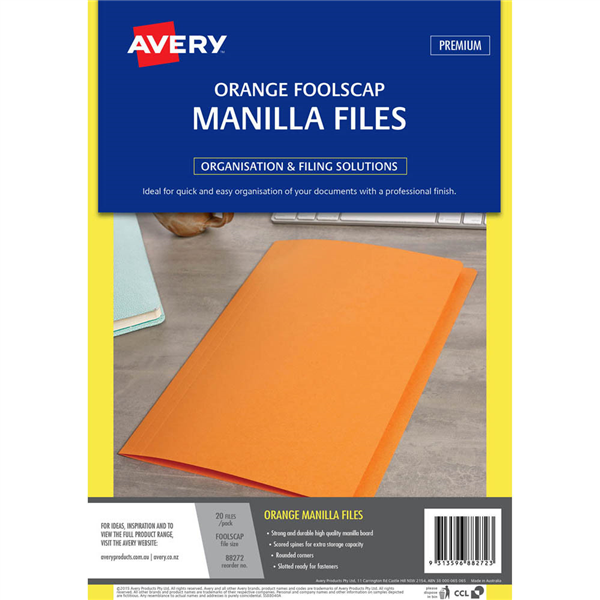 An Avery Manilla File is a simple filing solution to help you get organised Mix and match with different colours so filing is no longer boring! Avery Manilla Files offer the highest quality from a strong and durable manilla board Ideal for projects or personal files and suitable for compact archiving into storage systems Available in buff, range of other colours and foolscap, A4 sizes