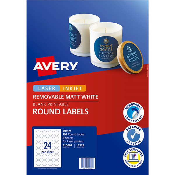 AVERY 910007 L7129 REMOVABLE BLANK LABELS ROUND LASER/INKJET 24UP MATTE 40MM WHITE PACK 192