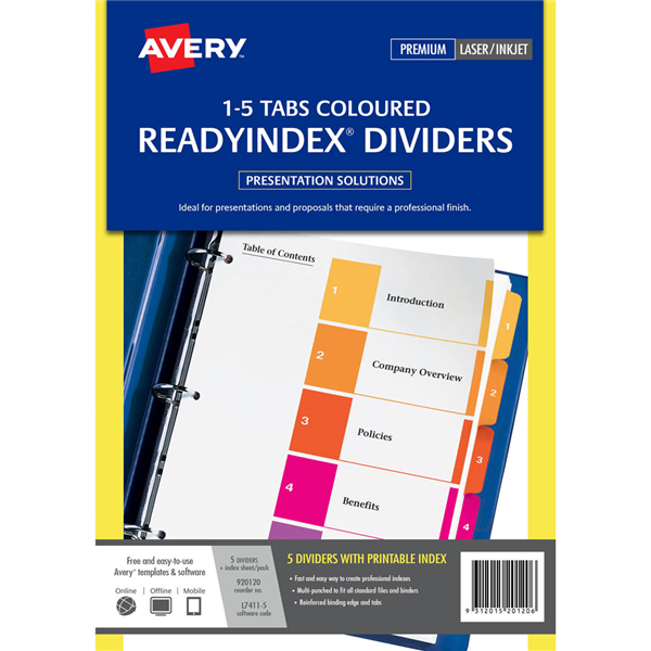 When you need important information, you need it fast. These ReadyIndex dividers help you stay organised so that you can locate documents quickly and easily. They feature a table of contents that you can customise and 5 pre-printed, numbered multi-colour tabs. And with free templates and software from www.averyproducts.com.au, you can customise the table of contents and print it on your laser or inkjet printer in minutes. Your efficiency just shifted up a couple of gears