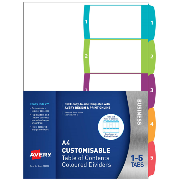 AVERY 922002 L7411-5 CUSTOMISABLE TABLE OF CONTENTS COLOURED DIVIDER 1-5 TAB A4