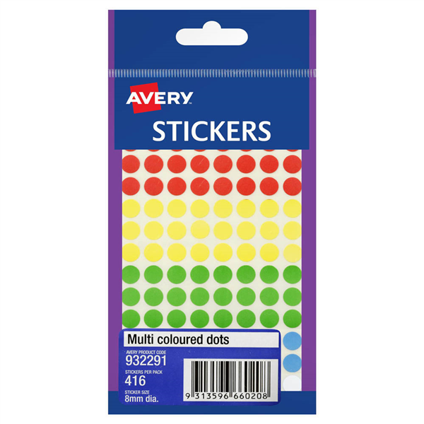 AVERY 932291 MULTI-PURPOSE STICKERS CIRCLE 8MM ASSORTED PACK 416