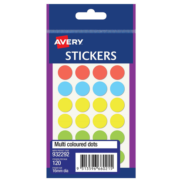 AVERY 932292 MULTI-PURPOSE STICKERS CIRCLE 16MM MULTI COLOURED PACK 140