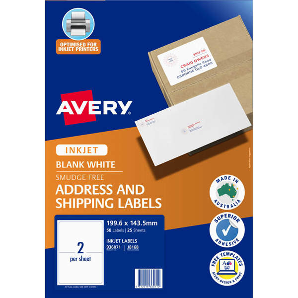 Inkjet label material is optimised for a smudge free professional finish Superior strong adhesive Customise your labels with our free and easy-to-use template software; Avery Design and Print - available at averyproducts.com.au/print Labels made with paper from sourced from sustainable forests