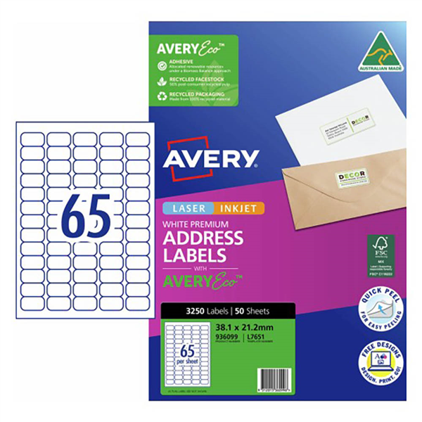 AVERY 936099 J8651 ADDRESS LABELS INKJET 65UP WHITE PACK 50