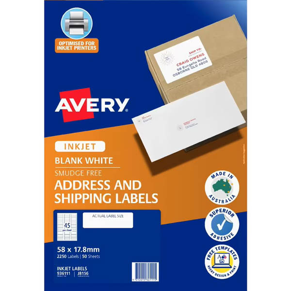 Avery address labels offer the Sure Feed feature which delivers a more reliable feed through your printer by preventing jams and misalignments These labels also come with a special Smudge Free promise, ensuring smooth print results with your inkjet printer so you can confidently apply the label straight onto your envelopes without any smudge marks Whether you're printing in black and white or adding colour, these bright white addressing labels dry instantly after printing with sharp text and colours for professional looking labels every time These labels feature Quick Peel which allows for quicker detachment of the label from the backing sheet Avery Certified labels are made with paper sourced from well-managed forests so you can be certain you are helping the environment Customise your labels with our free and easy-to-use template software; Avery Design and Print - available at averyproducts.com.au/print The packaging and labels can also be recycled Labels made with paper from sourced from sustainable forests