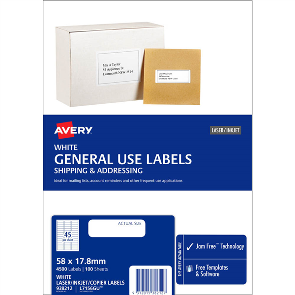 AVERY 938212 L7156 GENERAL USE LABEL LASER/INKJET 45UP WHITE PACK 100
