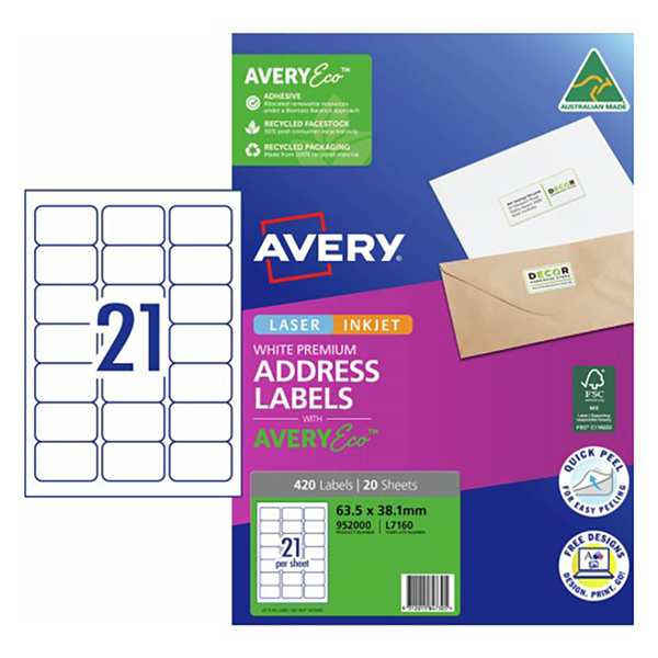 AVERY 952000 L7160 QUICK PEEL ADDRESS LABEL WITH SURE FEED LASER 21UP WHITE PACK 20