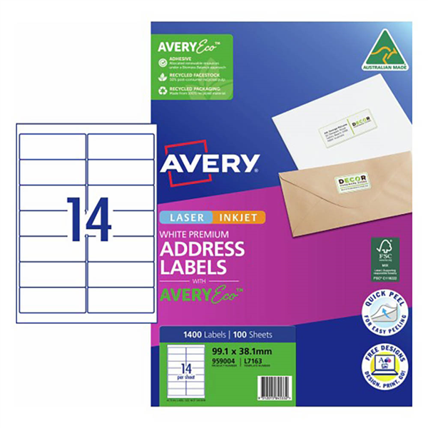 Quick Peel technology allows for quicker and easier detachment of labels from backing sheet Customise your labels with our free and easy-to-use template software; Avery Design and Print - available at averyproducts.com.au/print Special adhesive withstands the high heat of laser printers Labels made with paper from sourced from sustainable forests
