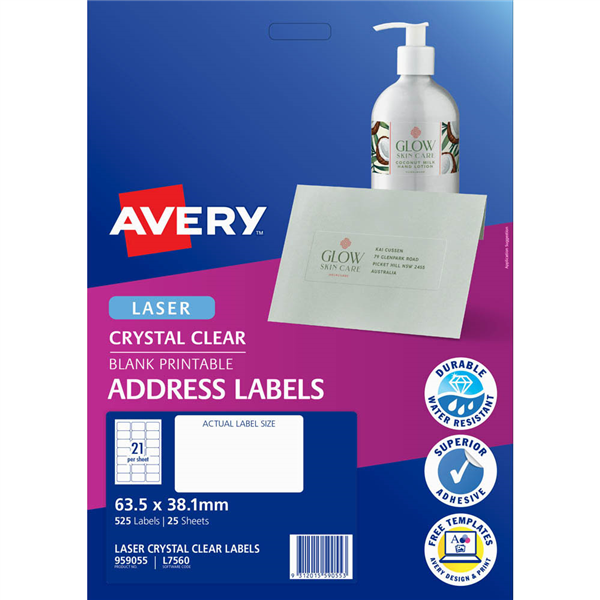 These glossy labels are 100% transparent and are incredibly durable (oil, dirt, splash and tear proof), adhering to almost any polished surface These labels are ideal for addressing on coloured envelopes, corporate events or wedding invitations You can create custom labels using free Avery software and templates at averyproducts.com.au Made from clear, glossy material and are 100% transparent Ideal for coloured envelopes, wedding invitations and corporate events Made from durable material, which is oil, dirt, splash and tear proof Developed for laser printers and guaranteed Jam Free Customise your labels with free Avery software and templates available at averyproducts.com.au/print