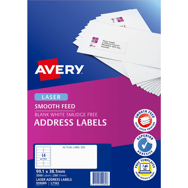 AVERY 959089 L7163 ADDRESS LABEL SMOOTH FEED LASER 14UP WHITE PACK 250