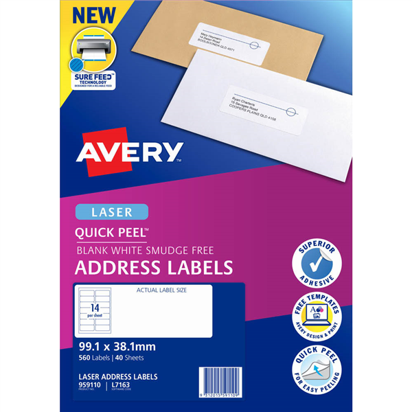 Quick Peel technology allows for quicker and easier detachment of labels from backing sheet Customise your labels with our free and easy-to-use template software; Avery Design and Print - available at averyproducts.com.au/print Special adhesive withstands the high heat of laser printers Labels made with paper from sourced from sustainable forests