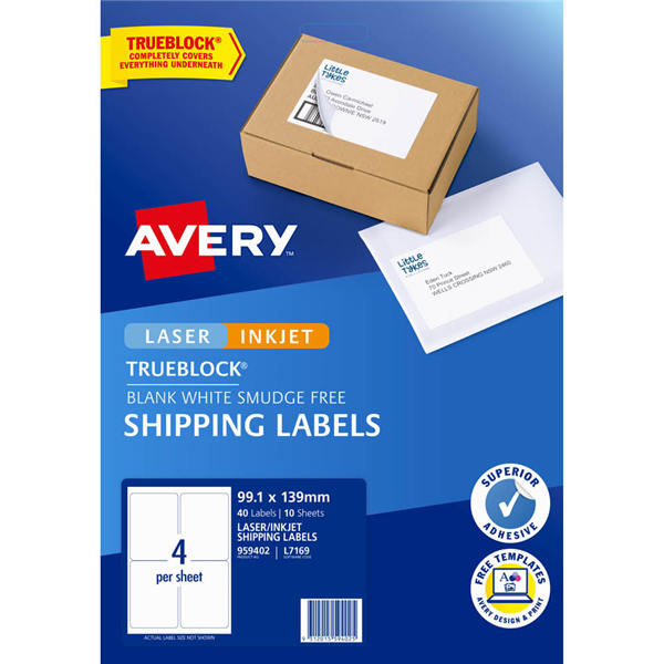 AVERY 959402 L7169 TRUEBLOCK INTERNET SHIPPING LABEL LASER 4UP WHITE PACK 10