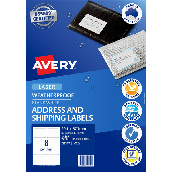 They stand up to tough weather and temperature conditions and resist scuffs, tears and smudges so they remain easy to read Each label can be customised with your logo and recipient details using Avery Design Print Online Now you can send professional-looking packages, every time Durable, water-resistant labels provide strong protection against harsh elements Perfect for shipping, addressing, priority messages, warning labels and more UV-resistant, water-resistant and waterproof Jam-free and smudge-free guaranteed Supported by free Avery software and templates available at averyproducts.com.au/print