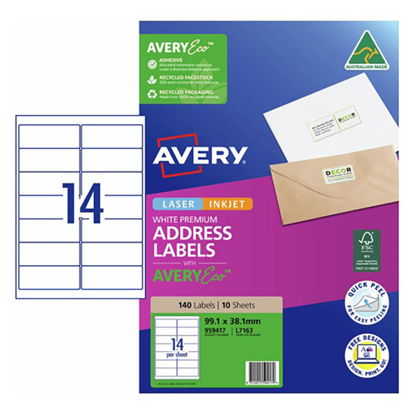 Quick Peel technology allows for quicker and easier detachment of labels from backing sheet Customise your labels with our free and easy-to-use template software; Avery Design and Print - available at averyproducts.com.au/print Special adhesive withstands the high heat of laser printers Labels made with paper from sourced from sustainable forests