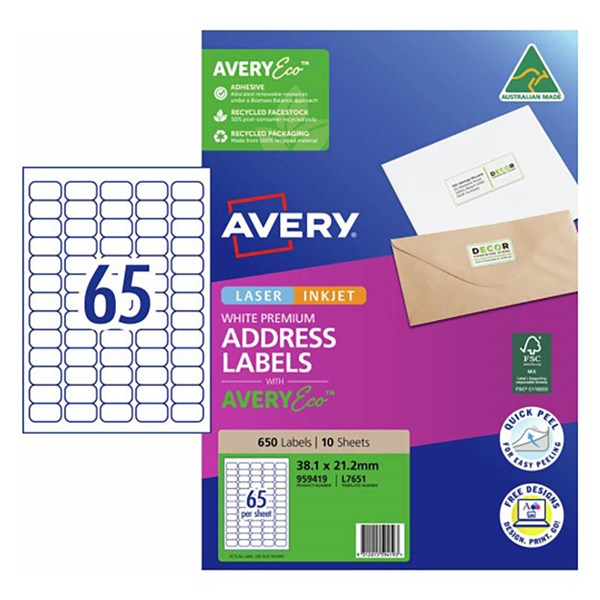 38.1 x 21.2 mm, Laser & Inkjet, White Designed for use in mailing rooms, warehouses, small businesses and anywhere else where you frequently print your own mailing and shipping labels Sure Feed technology which helps to minimise waste and inefficiency during your printing by ensuring a reliable feed and accurate print alignment The labels feature Quick Peel technology to ensure quick and easy detachment from the backing sheet for efficient application Customise your labels with our free and easy-to-use template software; Avery Design and Print - available at averyproducts.com.au/print Compatible with both laser and inkjet printers