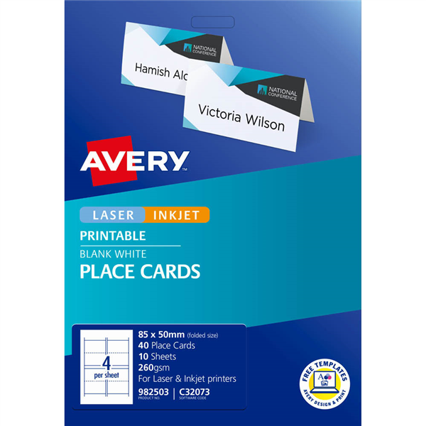 Made from matt white premium quality material and featuring Quick and Clean technology for a smooth edge professional finish, these cards are the perfect way to personalise your special occasion Customise your Placecards to match your special event theme and colour scheme by choosing from our range of pre-designed templates or create your own unique design Complement your Placecards with customised Invitations, Postcards, Gift Tags and Labels Its easy and affordable with free Avery templates and software Premium quality matt white card to display your individual designs Print-to-the-edge for a full colour, professional finish Print-shop quality, smooth edge cards Save money by only printing the number of cards you need Create your ideal theme with our free software and templates