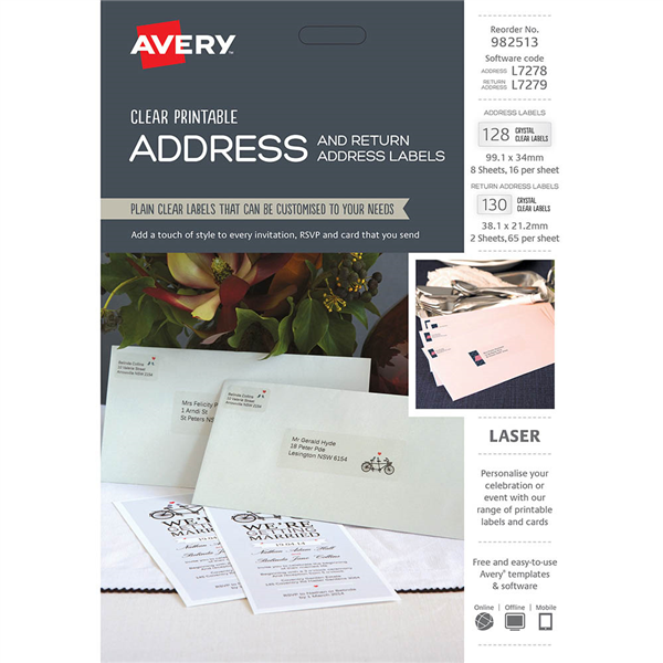 Made from a 100% transparent, glossy, durable material, these labels are the perfect way to personalise coloured envelopes with a crystal clear finish Customise your labels to match your special event theme and colour scheme by choosing from our range of pre-designed templates or create your own unique design Complement your Address Labels with customised Invitations, Postcards, Gift Tags and Placecards its easy and affordable with free Avery templates and software Crystal clear finish, ideal for coloured envelopes, wedding and event invitations 100% transparent, glossy, durable material is oil, dirt, splash and tear proof The perfect way to add a special touch to your invitations and cards that you send Create your ideal theme with our free software and templates