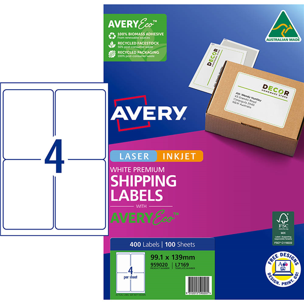 These trusty Avery white rectangular labels are also more than just a mailing solution Available in a wide variety of sizes, they are increasingly being used to help organise and clearly identify all manner of items in the office, in schools, hospitals, small businesses and around the home Avery Premium Address and Shipping labels, now with AveryEco There are 400 blank matt white labels in a pack of 4 labels per sheet