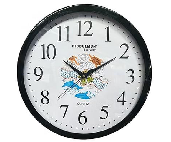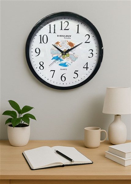 Enhance your space with the Bibbulmun Wall Clock, a perfect blend of cultural artistry and everyday functionality. With a 30cm diameter, this wall clock features a precision quartz movement and showcases a striking Indigenous-inspired design at its center, bringing a meaningful aesthetic to any room. Framed in a sleek black casing and featuring large, easy-to-read numerals, this clock complements both modern and traditional interiors. Whether in your home office, living room, or classroom, the Bibbulmun Wall Clock does more than tell time-it tells a story.
