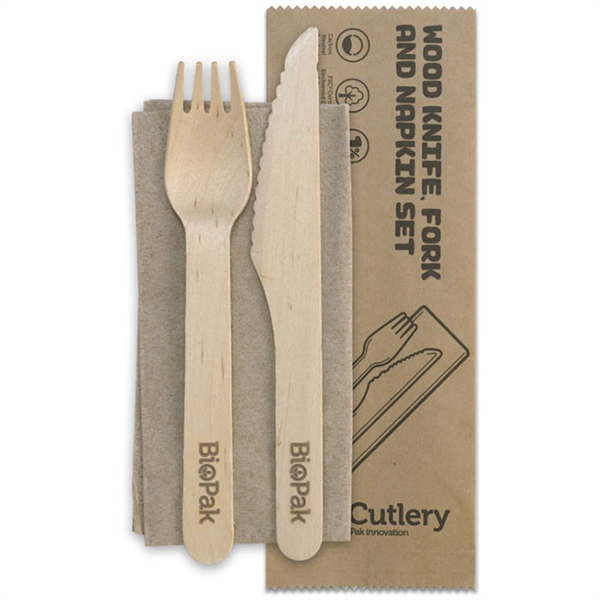 A great alternative to disposable plastic cutlery Eco-friendly disposable cutlery sets Suitable for hot and cold foods Each pack contains a knife, fork and napkin