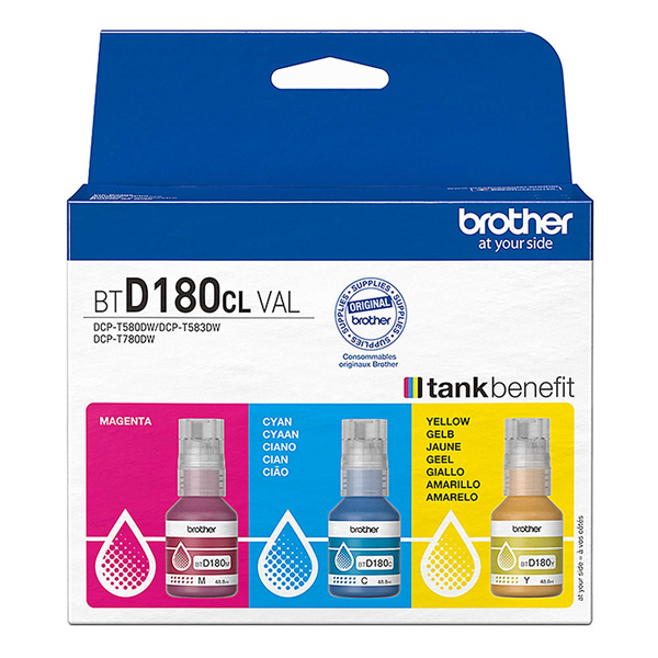 The Brother BTD180 Ink Cartridge Value Pack Assorted provides a complete set of ink bottles for vibrant and reliable printing
