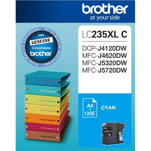 Consistent Quality Printouts - Experience consistently high-quality printouts with no streaking or smudging. Enjoy true-to-life images that can last for decades without fading SPECIFICATIONS Compatible with the following: BROTHER DCP J4120DW, BROTHER MFC J4620DW, BROTHER MFC J5320DW, BROTHER MFC J5720DW 1,200 Pages (estimated page yield provided based on 5% coverage or at ISO 2471 pattern/normal) Colour: Cyan OEM: LC-235XLCS UPC: 4977766743969
