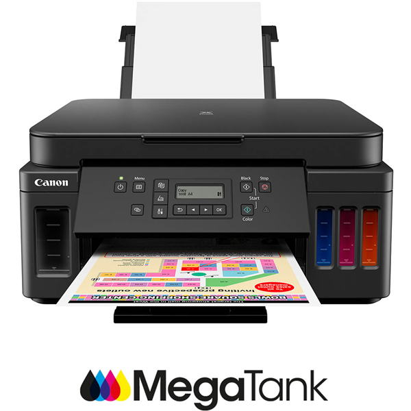 Canon PIXMA G6065 MegaTank - Refillable ink tank printer with two additional black ink bottles in the box, printing up to 18,000 pages in black or 7,700 pages in colour with the included set of inks. Combined with auto 2-sided printing, this printer delivers high yield, quality and functionality at a low cost per page