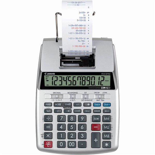 The portable Canon P23-DTSCII is ideal for a busy office environment Provides convenient functions for quick calculations of profit margins and currency conversion while also featuring 12-digits, 2 colour printing as well as a clock and calendar The P23-DTSCII is operated via battery but has an auto power off function to conserve battery energy or plug in to AC or DC power Don't wait around for your receipts to be printed. The advanced printer head delivers rapid printing speed of 2.3 lines per second on standard 57mm wide plain paper A large, upright angled LCD display makes figures highly legible while the spacious keyboard boasts durable colour coded keys for effortless entry P23-DTSCII supports tax calculations, cash change and currency conversion plus separate slide switch selectors for decimal, rounding and item count
