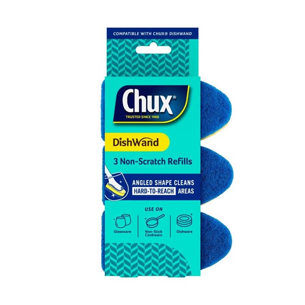 Wash up fast with Chux DishWand Non-Scratch Refills. Gentle enough to remove grease and grime from non-stick surfaces, yet still tough enough to tackle baked-on messes like a pro, these scouring pads will help maintain your non-stick cookware for long lasting performance. Plus, the angled shape reaches hard to clean areas to make cleaning glasses a breeze!