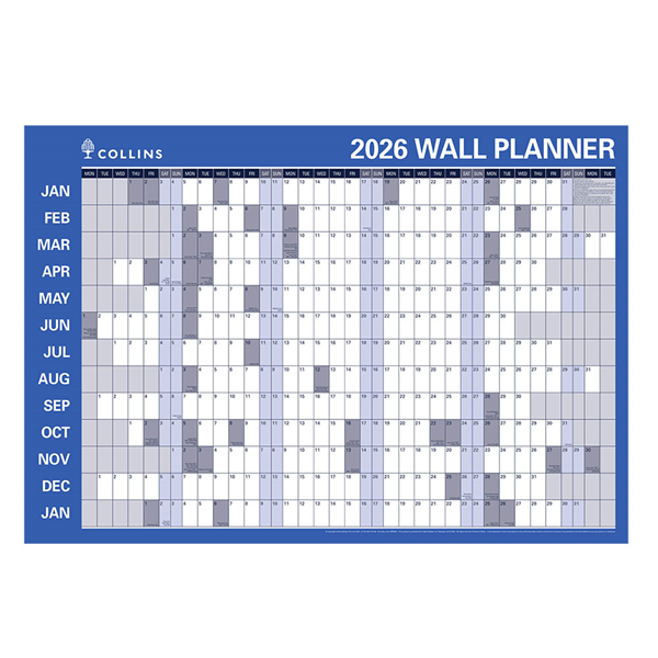 One side of the Collins Debden laminated roll up planner features months along the top and the other side has months running down the sides - choose your own layout! Featuring easy to read graphics and a clear layout, this wall planner allows for by the month and a full year in view Julian days (Calendar only) Australian and New Zealand public holidays in blue Shaded Saturday and Sunday