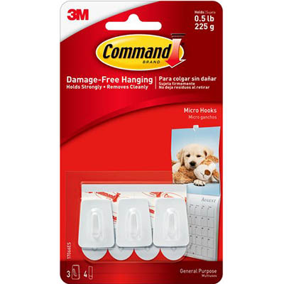 COMMAND ADHESIVE MICRO HOOKS WHITE PACK 3 HOOKS AND 4 STRIPS