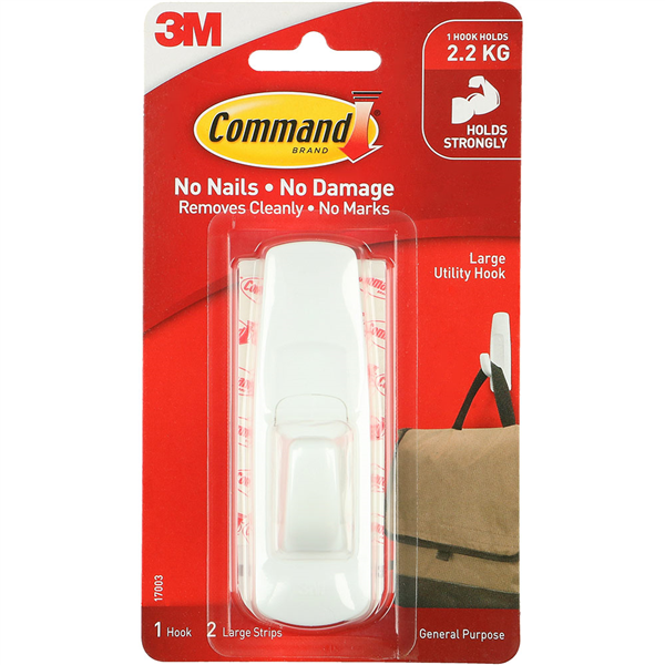 Command hooks are fast and easy to hang, using the revolutionary command adhesive, holds strongly on a variety of surfaces, including paint, wood, tile and more Rehanging them is as easy as applying a Command Large White Refill Strip, so you can take down, move and reuse them again and again! Damage-free hanging Holds strongly Easy to apply Works on a variety of surfaces Great for hanging bags, belts, Extension cords