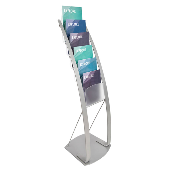 Contemporary floor stand features sleek curves and open design to create an inviting literature display