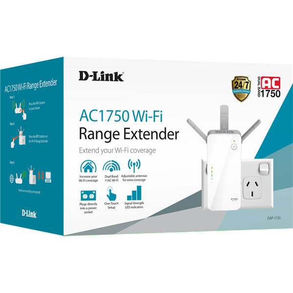 Extends Wi-Fi coverage and eliminates dead spots Extends both 2.4 GHz and 5 GHz for combined speeds up to 1750 Mbps Smart Signal Indicator helps you find the best location to get optimal Wi-Fi coverage throughout the home Built-in Setup Wizard for simple setup and configuration AP mode ideal for homes that are pre-wired for Ethernet or for extended coverage Entend your wireless network and eliminate dead spots Works with any router and ISP gateway External antennas for more coverage- External antennas help to improve Wi-Fi coverage throughout large homes and even backyards. Better Wi-Fi Coverage and more speed Easy set up- WPS button setup extends your network at the push of a button; STEP 1 : Press the WPS button on your router; STEP 2 : Press the WPS button on the DAP-1720; STEP 3 : You're successfully connected