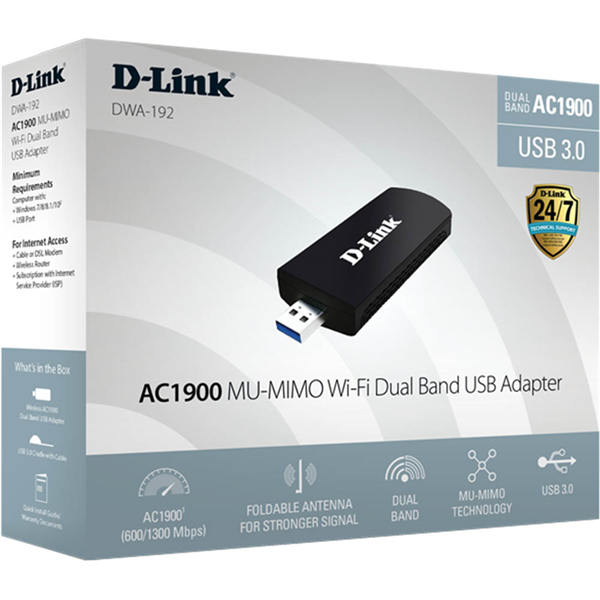 Ultimate Wi-Fi Performance- Gives your desktop or Laptop PC speeds up to 1900 Mbps2 for a faster connection USB 3.0 Interface- 10x Faster then USB 2.0 Dual-Band Wireless- 2.4 GHz and 5 GHz bands for flexible connectivity WPS Button- One button setup for a fast and secure connection Advanced AC SmartBeam- Focuses wireless signal towards your router for enhanced connection quality Backwards Compatible- Connects to legacy 802.11n/g/a networks The DWA-192 is powered with a 3 x 3 antenna design supporting speeds of up to 600Mbps on the 2.4GHz and 1300Mbps on the 5GHz to deliver fast wireless speeds and less interference for maximum throughput. It is the perfect match for your high performance router Use the 2.4GHz Band for everyday taks such as surfing the web or chatting online while leaving the high-speed 5GHz AC Band free for video streaming, online gaming and large file transfers Improves coverage by directing bandwidth to your devices as you move around your home. You can stream HD video, surf the web, skype your friends and play online games from wherever you are so you will always get the best experience Use DWA-192 that will extend the signal to your router, for a wall penetrating Wi-Fi performance with three times the range of standard Wi-Fi adapters SuperSpeed transfer mode will let you transfer data 10x faster than USB 2.0 standard. Get increased performance and better power management With its cool looking design, the DWA-192 is the only AC1900 USB adapter that comes with a design that will get everyone's attention