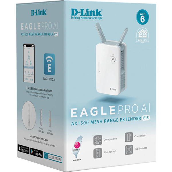 Extend your Wi-Fi with next-generation Wi-Fi 6 speeds. The E15 offers incredible extended AX1500 Wi-Fi coverage, with AI assistance and seamless Mesh that optimises your network automatically, so you can get rid of black spots and dropouts throughout your property Instantly Extend Your Wi-Fi or Create a Hotspot - 4 simultaneous streams, 1024 QAM, BSS Colouring and MU-MIMO ensure you'll always have the best connection quality possible AX1500 Wi-Fi 6 Performane - Designed for today's device-dense homes. Ideal for 4K streaming, VR gaming, video calling, and keeping all your smart home devices connected Powered by AI - AI-based capabilities empower your network to automatically optimise itself. And create a safe online experience for your family with parental controls OFDMA - Small data packets destined for multiple devices are transmitted together and never have to queue up again. Perfect for bandwidth-hungry devices battling for bandwidth Easy Setup & Management - Easy to set up with a touch of a button through WPS or the EAGLE PRO AI app Expandable Coverage - D-Link Wi-Fi Mesh allows you to create a reliable Mesh network with other D-Link Wi-Fi Mesh devices, enabling up to a total of 600sqm coverage Expanding Your Wi-Fi Network Is Easier Than Ever - From single-storey apartments to multi-storey houses with garden decks - simply add E15 Wi-Fi Extenders to your existing network and enjoy an extended network that eliminates Wi-Fi dead zones in those hard-to-reach areas. You can also create a seamless Mesh network by using the Extender with D-Link's EAGLE PRO AI and Mesh products Enjoy AI Convenience And A Reliable Mesh Network - When used together with the D-Link R15 EAGLE PRO AI Router, you can enjoy AI features and seamless Mesh that continuously connects you to the best Wi-Fi channel using its AI Wi-Fi Optimiser, as well as prioritises your most critical Internet usage for optimal online stability via its AI Traffic Optimiser, ensuring the strongest signal and fastest speeds are always being automatically delivered to all corners of your home Faster And More Efficient Than Ever Before - Next-gen Wi-Fi 6 is perfect for Smart Homes where you need fast and reliable connectivity on multiple devices at the same time. Wi-Fi 6 provides a strong network that enables the whole family to stream, game or work, without having to worry about buffering, dropouts or interference Reliable And Efficient Connectivity - The E15 Extender features bi-directional MU-MIMO to handle more simultaneous users at faster data rates, and beamforming technology greatly extends Wi-Fi coverage area and boosts overall network efficiency Fast-Track All Your Data And Connect More Devices - Increase your network capacity by up to 4x by using Wi-Fi 6, which uses 8x8 uplink/downlink, OFDMA, and BSS Colouring to handle more devices on your network with incredible efficiency Convenient Wall-Plug Design - The E15 Extender is designed to be simple to install, intuitive to use and an inconspicuous addition to your household decor The space-saving wall plug design includes a WPS (Wi-Fi Protected Setup) button that enables rapid setup, and a visual Wi-Fi signal indicator that will help you find the optimal spot in your home. The E15 Extemder also comes with a handy Gigabit Ethernet port for when you need wired connectivity Stay Protected From Online Threats - Privacy has become more important than ever