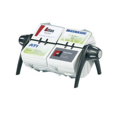 Durable visifix rotary business card file's special rotation mechanism keeps the viewed card in place and large ergonomic knobs have cushioned inserts for easy turning
