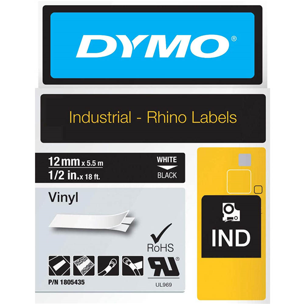DYMO 1805435 RHINO INDUSTRIAL TAPE VINYL 12MM WHITE ON BLACK