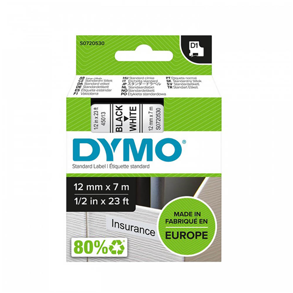 DYMO 45013 D1 LABELLING TAPE 12MM X 7M BLACK ON WHITE