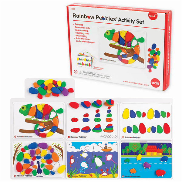 Develop fine motor skills Learn sorting, counting & sequencing Links science, mathematics and art. It will stimulate children's imagination and creative thinking skills Children also learn colors, shape recognition, counting, sorting, classifying, patterning, sequencing, construction and stacking Develop problem solving and creative design skills Set includes 48 pebbles in 4 sizes and 6 colours Comes with 12 double sided A4 activity cards