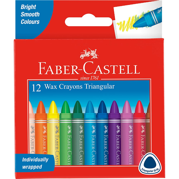 FABER-CASTELL TRIANGULAR GRIP WAX CRAYONS ASSORTED PACK 12