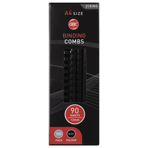 GBC PLASTIC BINDING COMB ROUND 21 LOOP 12MM A4 BLACK PACK 100