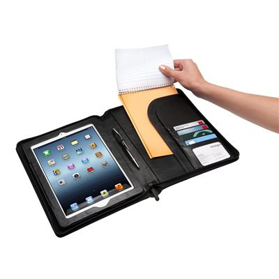 Get more done, more easily with the Kensington Folio Executive mobile organizer. Just slide your iPad into the folio executive and you'll have an integrated stand for viewing and reading in landscape or portrait positions. The folio executive accepts spiral notebooks or note pads measuring 7 Inch x 9.5 Inch or smaller with slots for business cards, pens and a stylus. The microfiber interior will protects your iPad screen and the zippered case keeps your iPad and valuables secure while on the go.