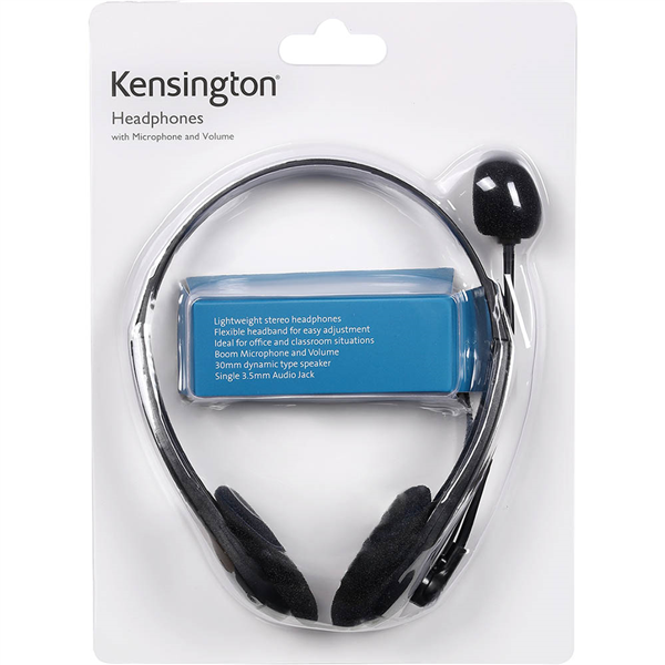 Kensington introduce the ideal solution, with stereo sound, inline microphone and adjustable headset band Lightweight stereo headphones Flexible headband for easy adjustment Ideal for office and classroom situations Inline Microphone and Volume 30mm dynamic type speaker Single 3.5mm Audio Jack 1 Year Warranty