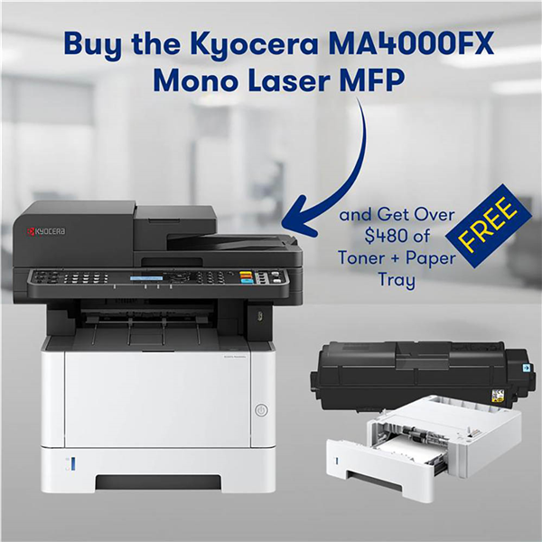 • Purchase a Kyocera MA4000FX and receive a bonus PF-1100 (valued at $259) and TK-1274 (valued at $228)