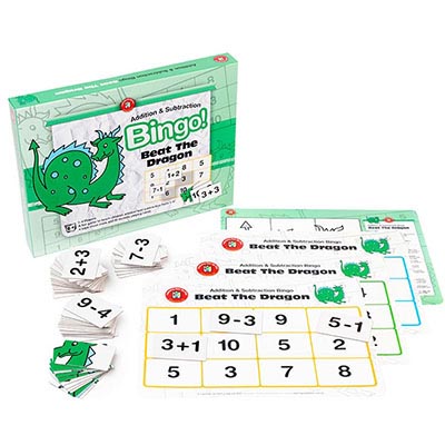 Beat The Dragon (Addition and Subtraction Bingo) is played in a similar manner to traditional Bingo with the children taking turns to select one card from the deck