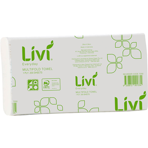 LIVI BASICS MULTIFOLD HAND TOWEL 1-PLY 200 SHEET 230 X 240MM CARTON 20